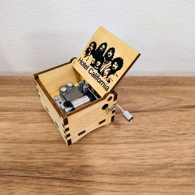Disfruta de una de las melodías más icónicas del rock con esta caja musical de manivela de “Hotel California”, inspirada en el legendario tema de Eagles.